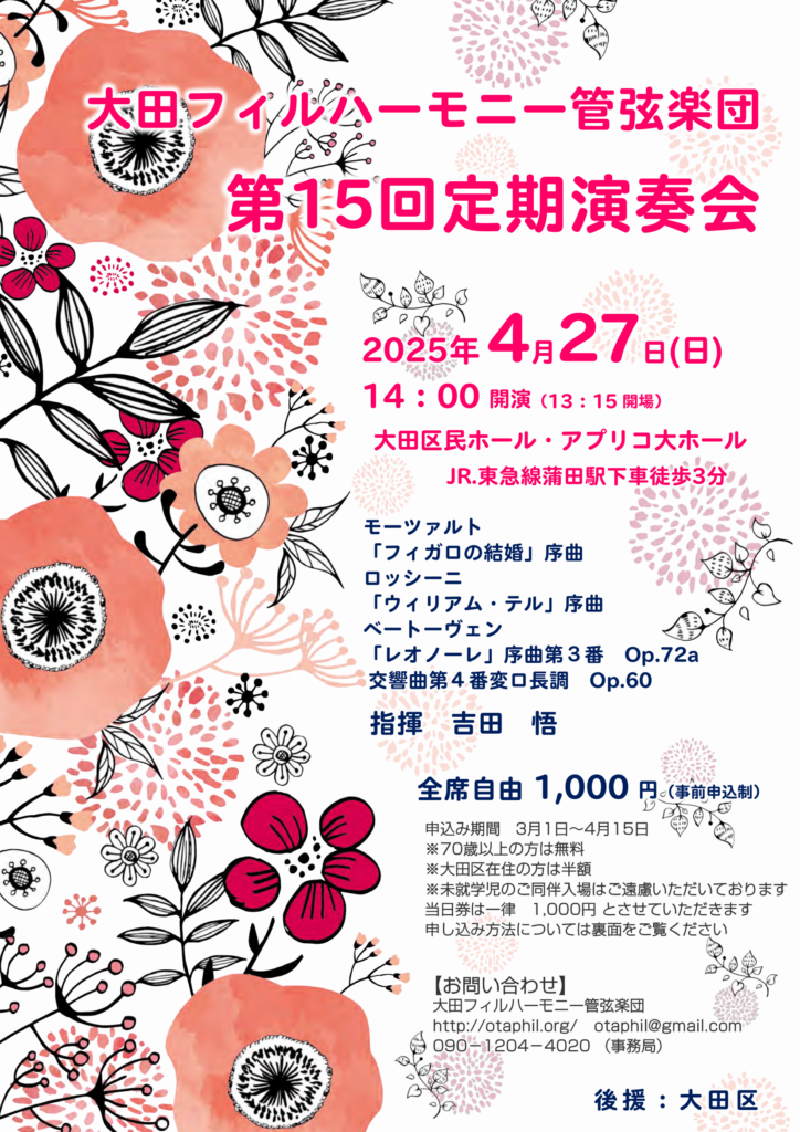 日時:2025年4月27日(日) 14:00開演 (13:15開場) 会場:大田区民ホール・アプリコ 大ホール 入場料:1,000円(70歳以上の方は無料、大田区在住の方は500円)(事前申込制。当日…