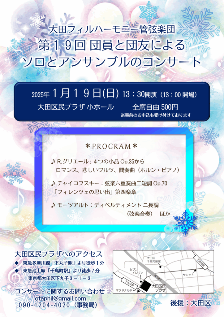 日時:2025年1月19日(日)開演 13:30 (開場 13:00) 会場:大田区民プラザ 小ホール 入場料:500円(全席自由)※事前のお申込も受け付けております 曲目: R.グリエール / 4つ…